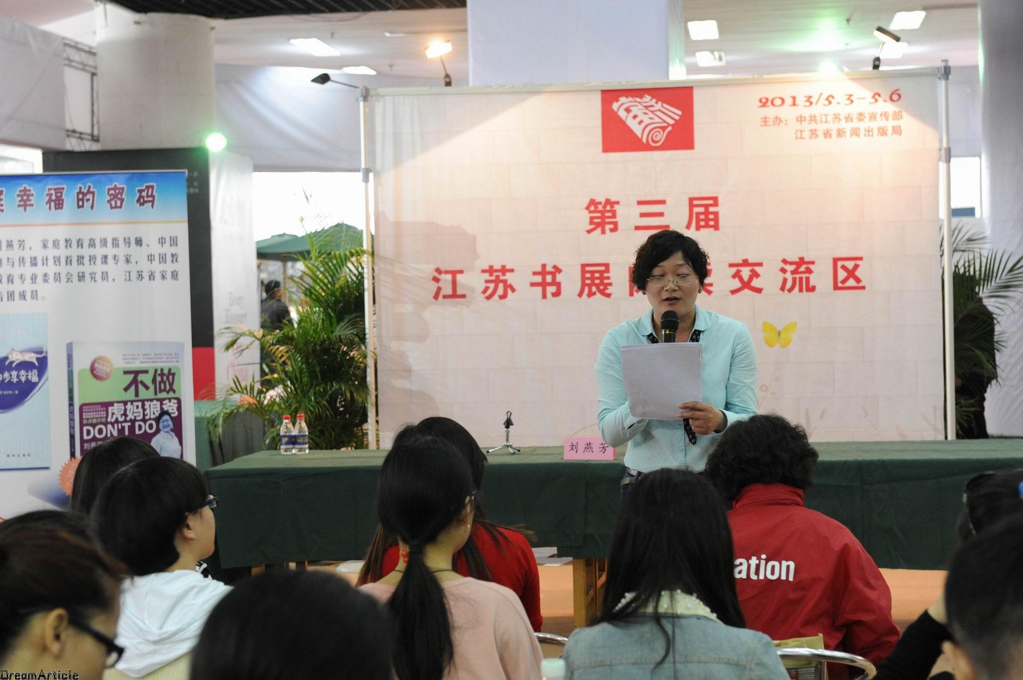 “家庭幸福的密碼”主講嘉賓劉燕芳,著名的“燕子老師”,是家庭教育高級(jí)指導(dǎo)師、中國(guó)家庭教育激勵(lì)與傳播計(jì)劃首批授課專(zhuān)家,中國(guó)教育學(xué)會(huì)家庭教育專(zhuān)業(yè)委員會(huì)研究員,江蘇省家庭教育專(zhuān)家報(bào)告團(tuán)成員。2012年推出《不做虎媽狼爸》一書(shū),深受廣大讀者的喜愛(ài),在社會(huì)上引起了一定的反響,在去年的江蘇書(shū)展上她激情演講,成功舉辦了一場(chǎng)“父母與孩子如何有效溝通”的講座。今年書(shū)展,劉燕芳在閱讀交流區(qū)再次就“家庭幸福的密碼”這個(gè)話(huà)題與讀者親密互動(dòng),把“家庭幸福密碼”分別設(shè)為一個(gè)字“愛(ài)”、兩個(gè)字“珍惜”、三個(gè)字“不計(jì)較”、四個(gè)字“親密有間”,并邀請(qǐng)現(xiàn)場(chǎng)觀眾就這個(gè)話(huà)題暢所欲言,最后,活動(dòng)在劉燕芳帶領(lǐng)大家聲情并茂地朗誦《相親相愛(ài)的一家人》中結(jié)束。
